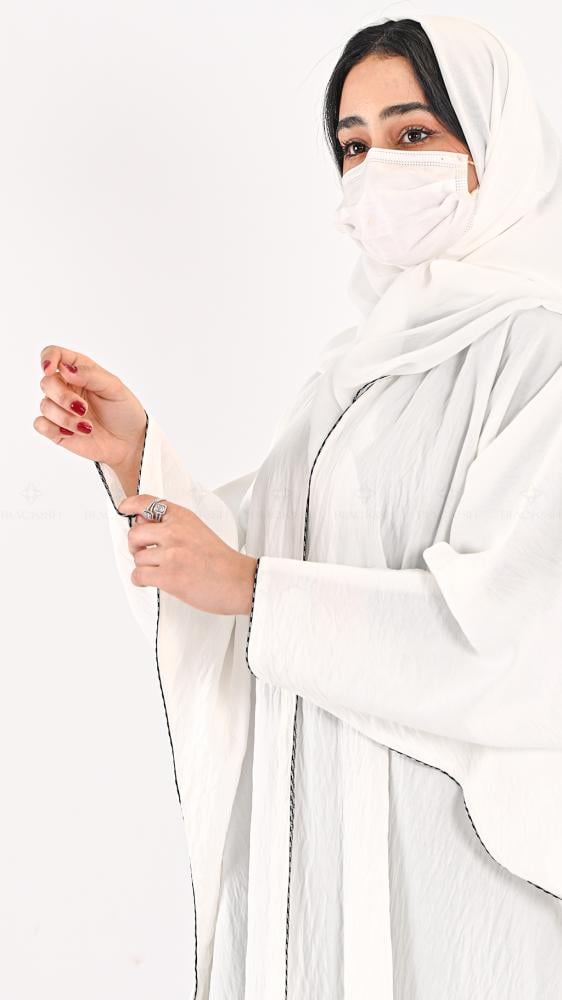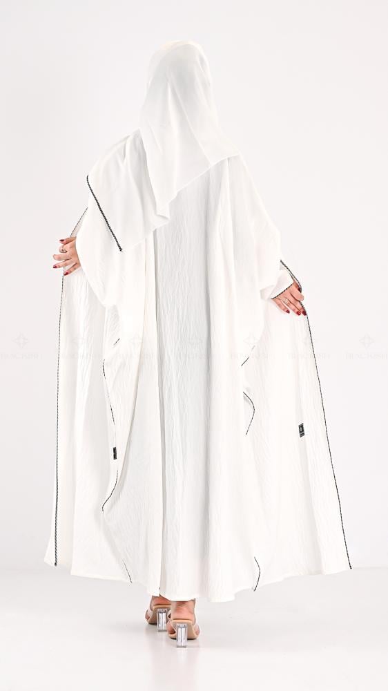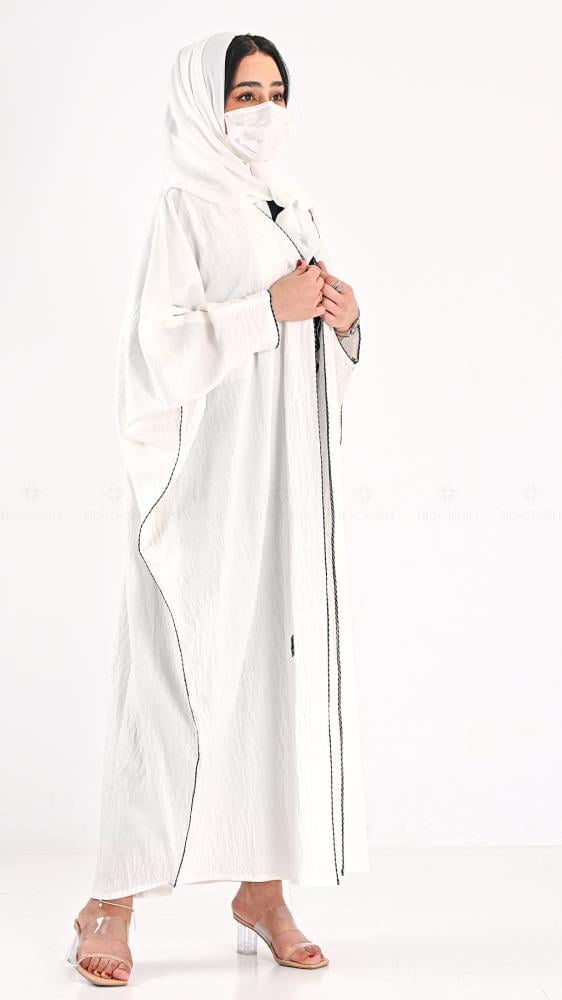 - تصميم أنيق للعباية: مع تحديد بالقيطان الأبيض والأسود الذي يضفي لمسة من التباين الراقي الذي يبرز جمال العباية.
