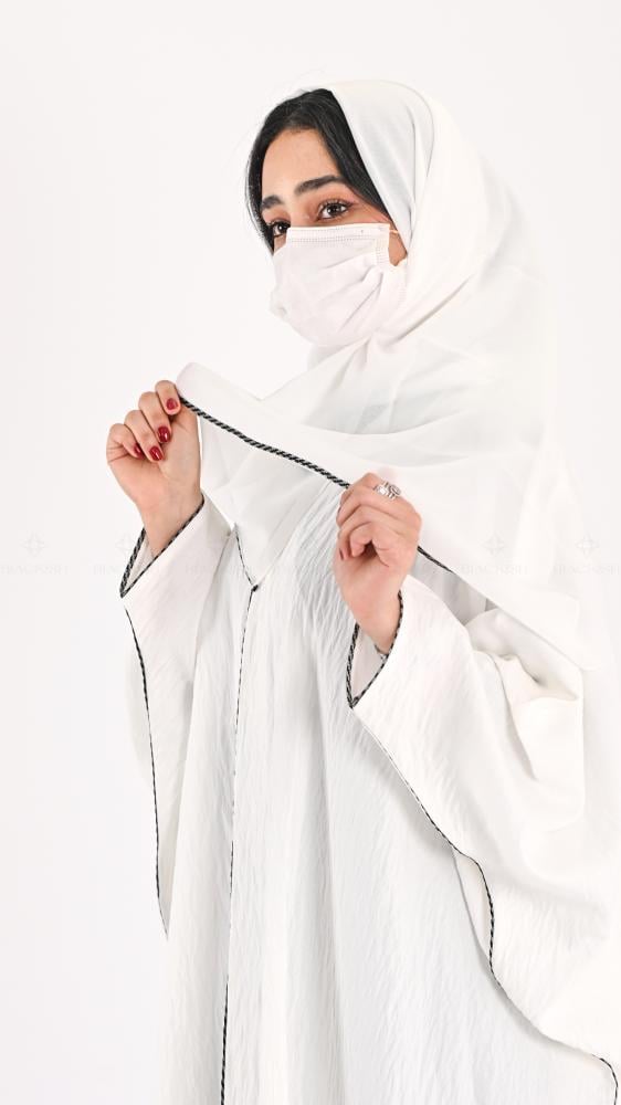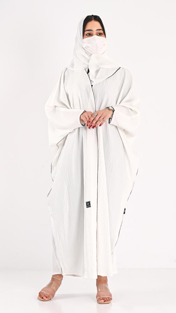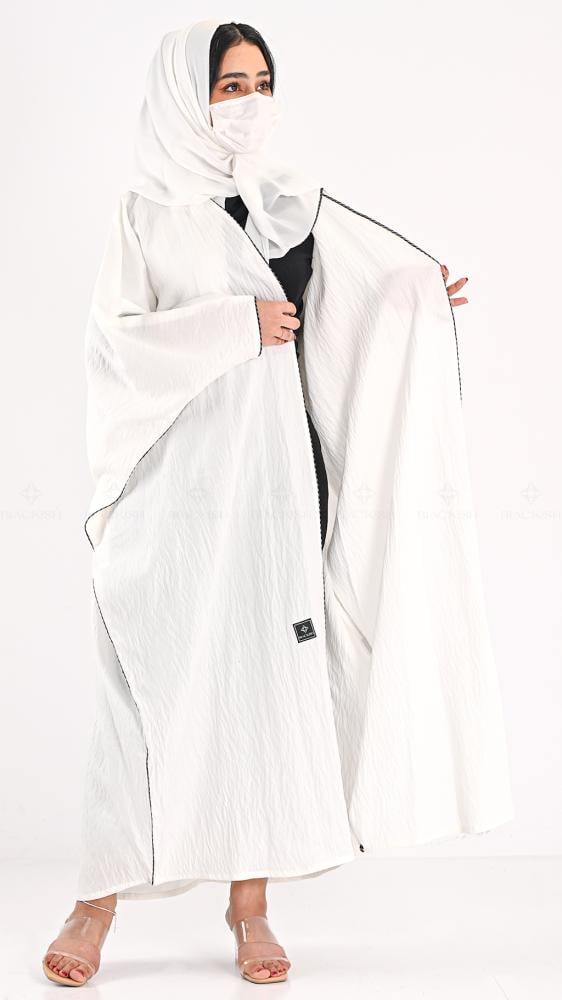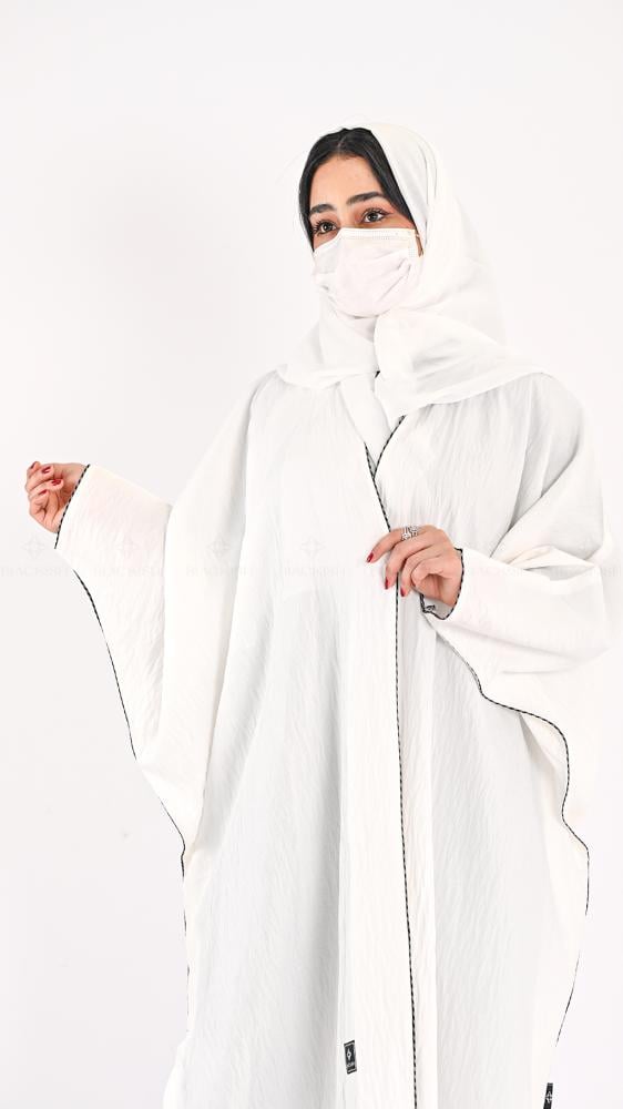 تألقي بإطلالة راقية وعصرية مع عباية مشلح لف باللون الأبيض، المصنوعة من قماش الكريب البحريني الفاخر. تتميز هذه العباية بتصميم أنيق ومميز، حيث تم تحديدها بقيطان باللونين الأبيض والأسود، مما يضفي عليها لمسة من الجذابية. كما أن قماش الكريب البحريني يوفر للعباية انسيابية رائعة وراحة فائقة في الارتداء، مما يجعلها خياراً مثالياً لكل من تبحث عن الأناقة والتميز في إطلالاتها اليومية أو الرسمية.