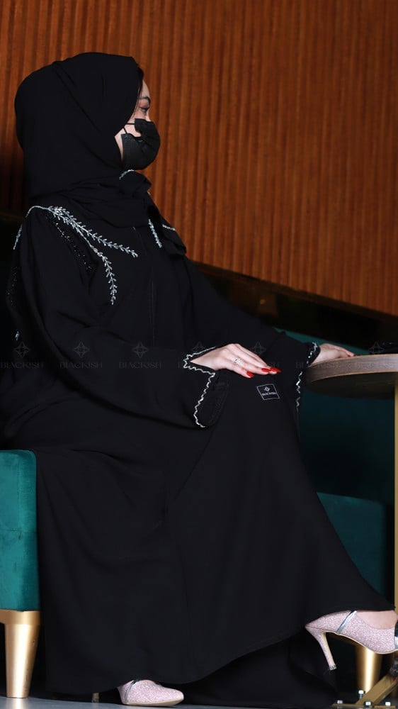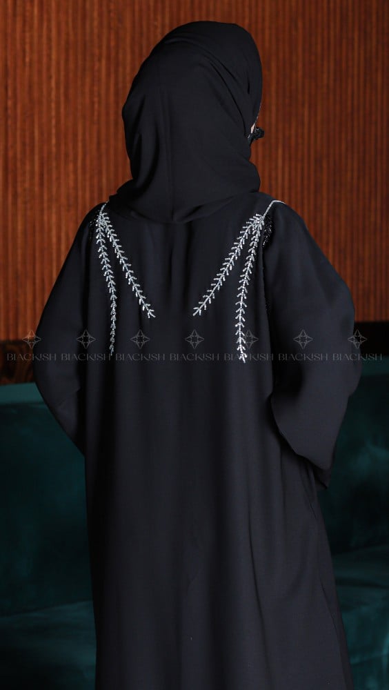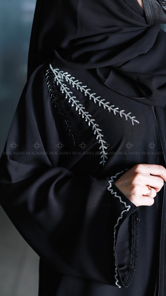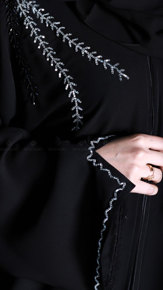 عباية كتف سوداء كريب ملكي: أناقة مميزة مع تطريز فاخر بالخرز